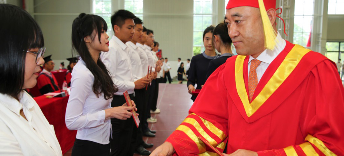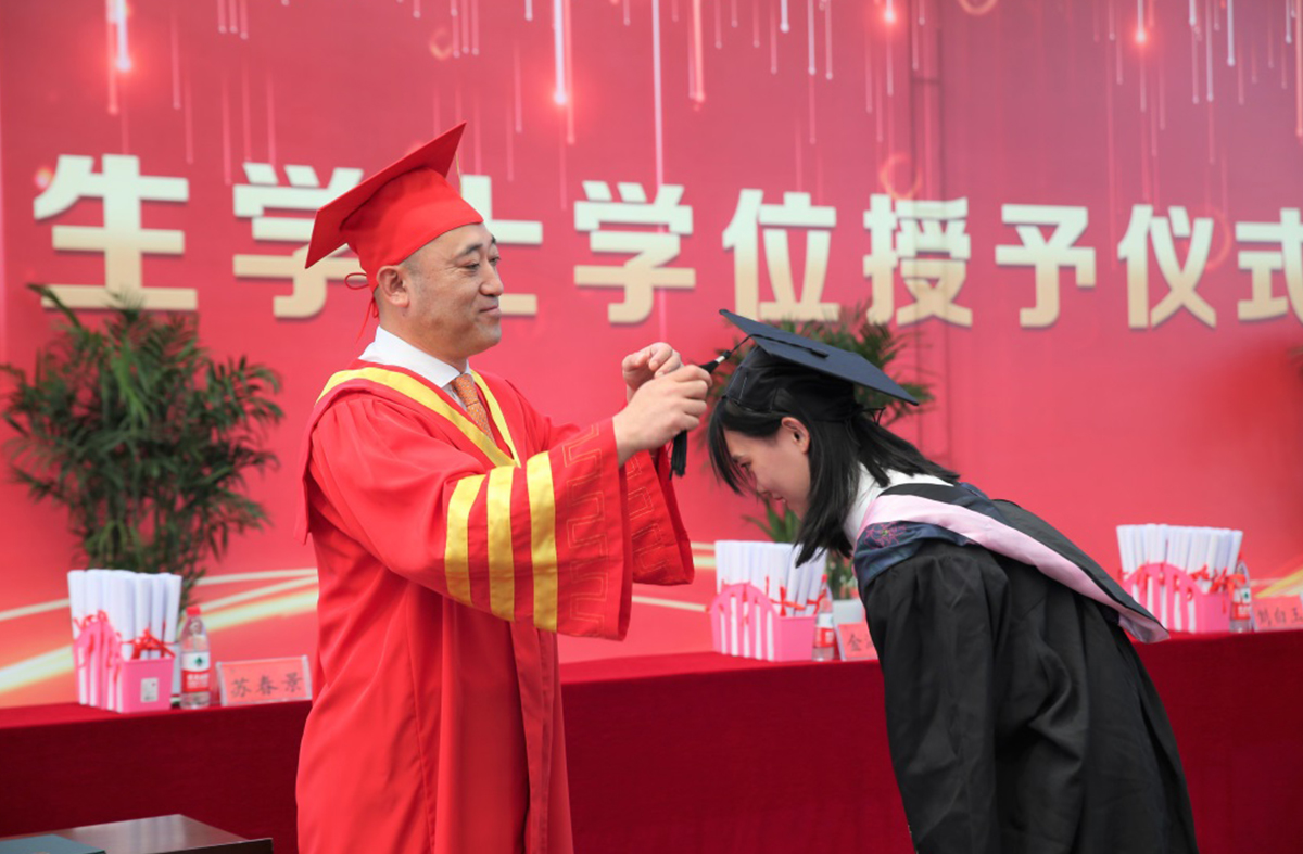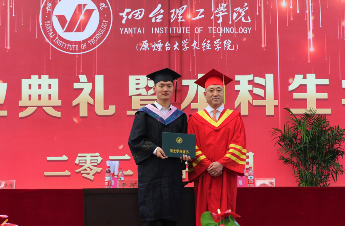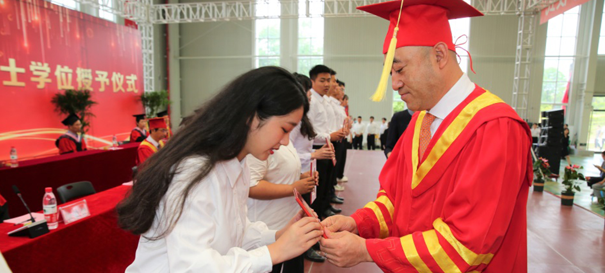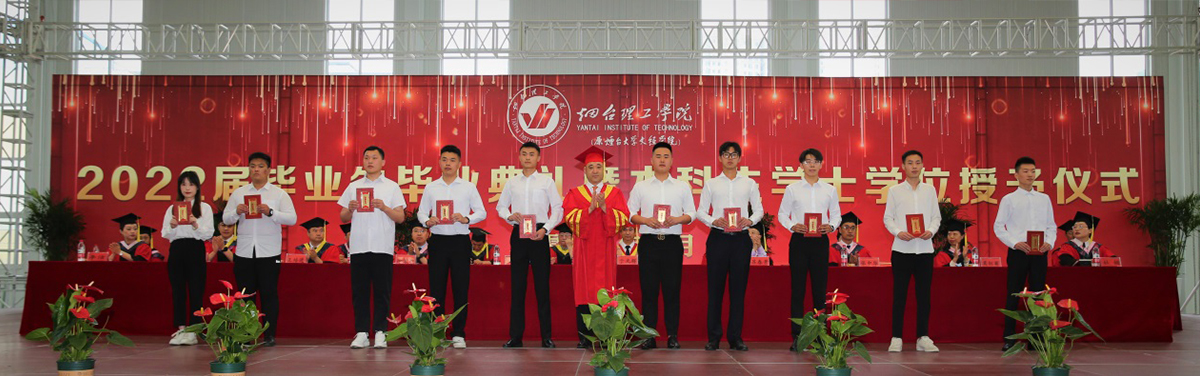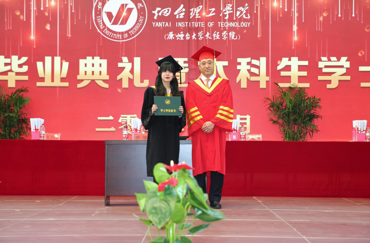 大會(huì)最后,辛軍董事長(zhǎng)、煙臺(tái)理工學(xué)院校領(lǐng)導(dǎo)及導(dǎo)師為獲得學(xué)士學(xué)位的畢業(yè)生頒發(fā)證書(shū),扶正流蘇并合影留念。