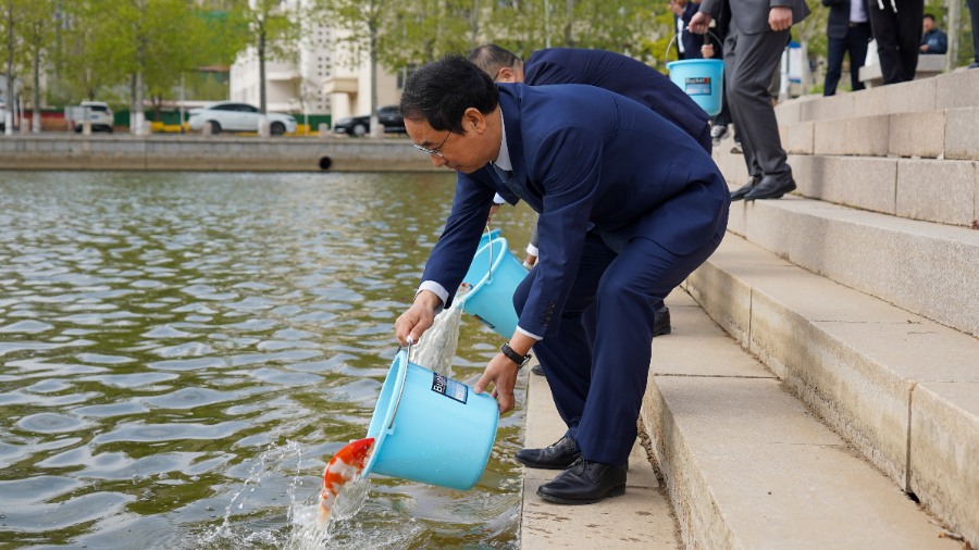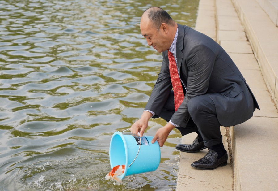 辛軍董事長、徐榮哲副總裁、于光輝校長、盛國軍書記等校領(lǐng)導(dǎo)及學(xué)生代表分別放養(yǎng)了錦鯉,為即將到來的校慶盛典添彩助力。