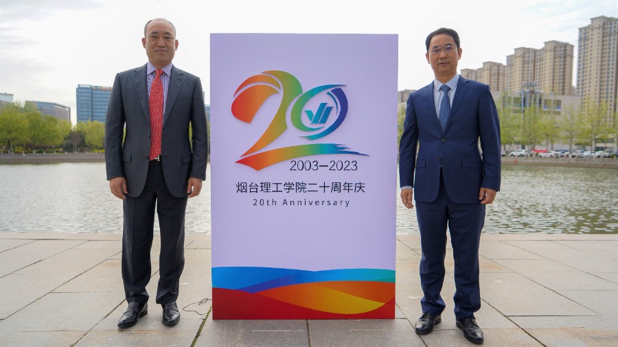 煙臺理工學(xué)院黨委書記盛國軍主持并介紹本次活動內(nèi)容,辛軍董事長、于光輝校長共同為校慶20周年LOGO揭彩。