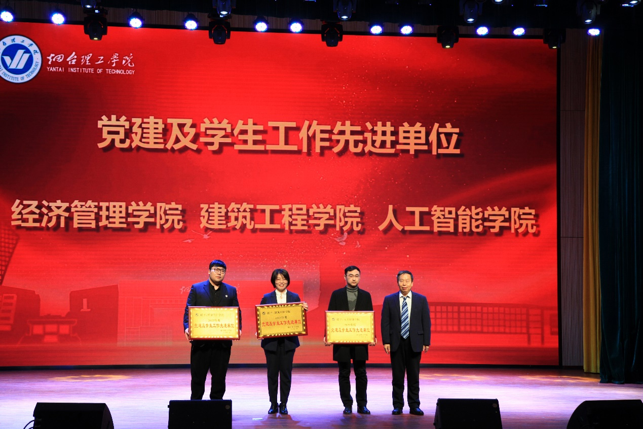 祥隆企業(yè)集團董事長、煙臺理工學院董事長辛軍及其他校領導為“目標管理先進單位”教學單位、“黨建及學生工作先進單位”等先進單位頒獎。